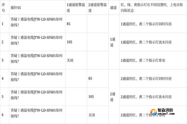 1通道報(bào)警溫度設(shè)定:S5拔碼開關(guān)上的1、2為1通道溫度設(shè)定,1、2都在下部OFF位置時(shí)報(bào)警溫度為85度、1在上部ON位置與2在下部OFF位置時(shí)報(bào)警溫度為105度、1在下部OFF位置與2在上部ON位置時(shí),1通道關(guān)閉。按要求設(shè)定好1、2后上電,按下1通道模擬火警按鈕2秒后按下復(fù)位按鈕,1通道紅色火警燈與黃色故障燈的閃爍狀態(tài)與所設(shè)置溫度閃爍狀態(tài)相同溫度設(shè)定成功。