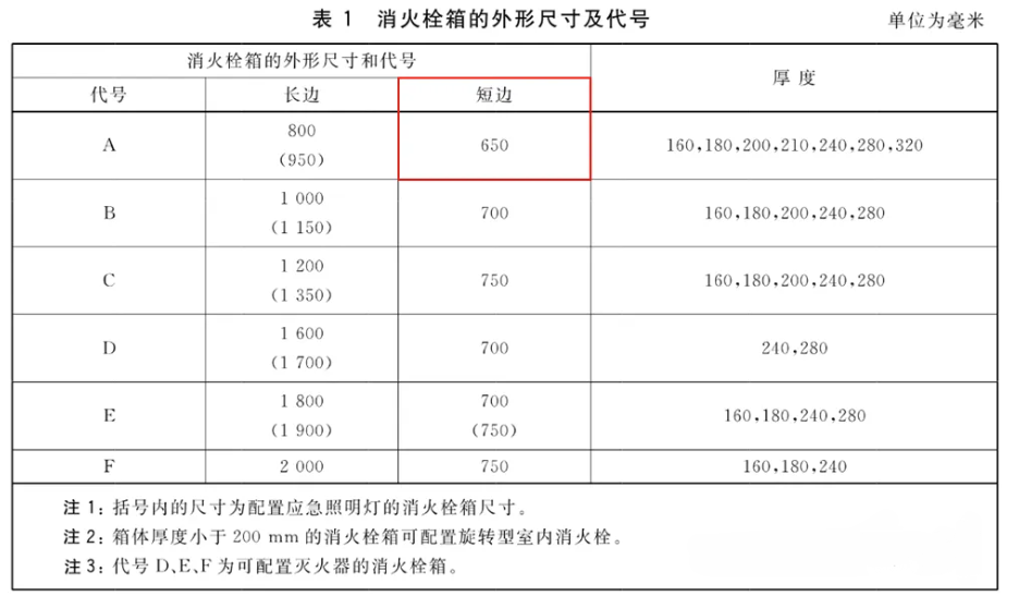 但是,國標(biāo)中消火栓箱短邊最小為650mm,短邊小于650mm的消火栓箱屬于窄型消火栓箱,即非標(biāo)箱,非標(biāo)箱的應(yīng)用目前存在爭論。